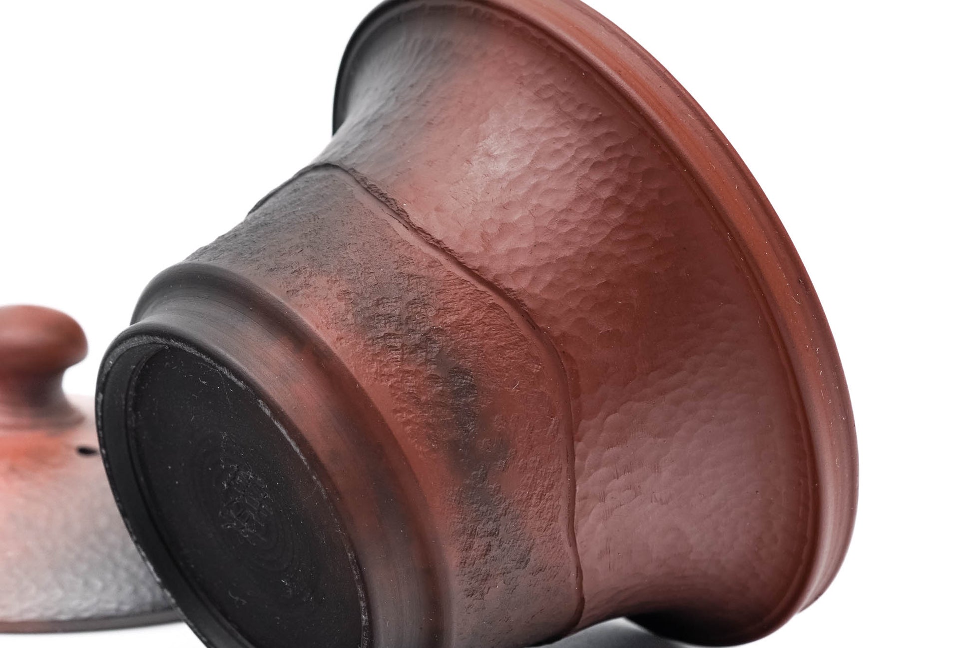 This exquisitely crafted Tokoname-yaki houhin (handleless teapot) has a unique flared shape and is made from the iconic Tokoname shudei (ÖìÄà) clay, known for its brilliant red colour and ability to subtly reduce the astringency of tea. This pot has a striking y¨hen (¸G‰ä) gradient from a rich red to a deep black, created by a second reduction firing in which the pot is half covered in rice husks. The surface features Yoshiki's signature hammered finish, called tataki. The teapot's built-in ceramic do-ake filter is perfect for naturally straining tea.