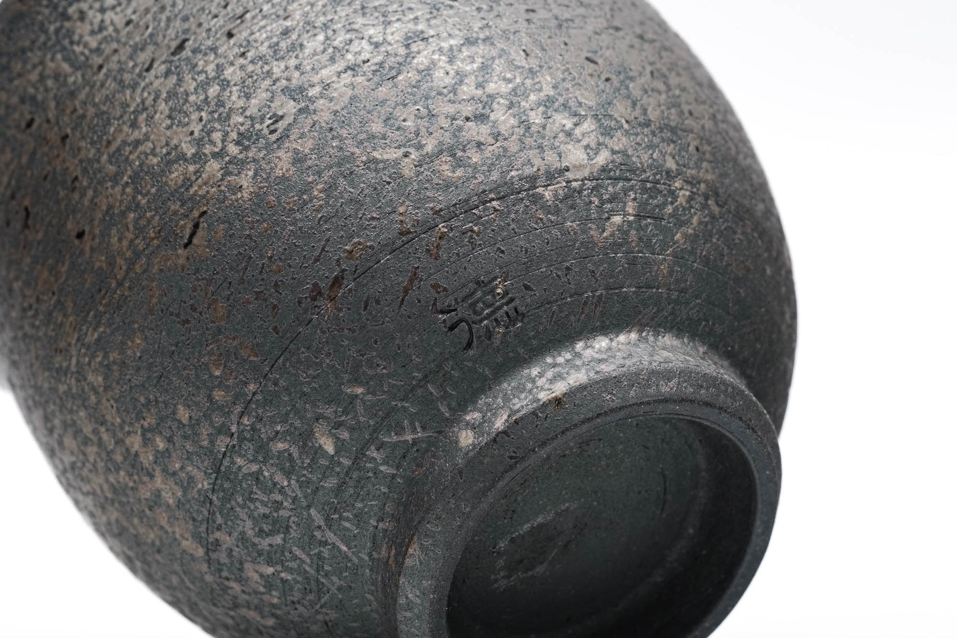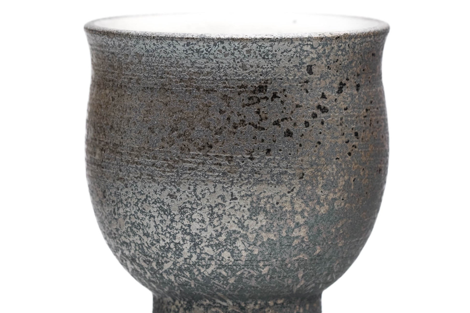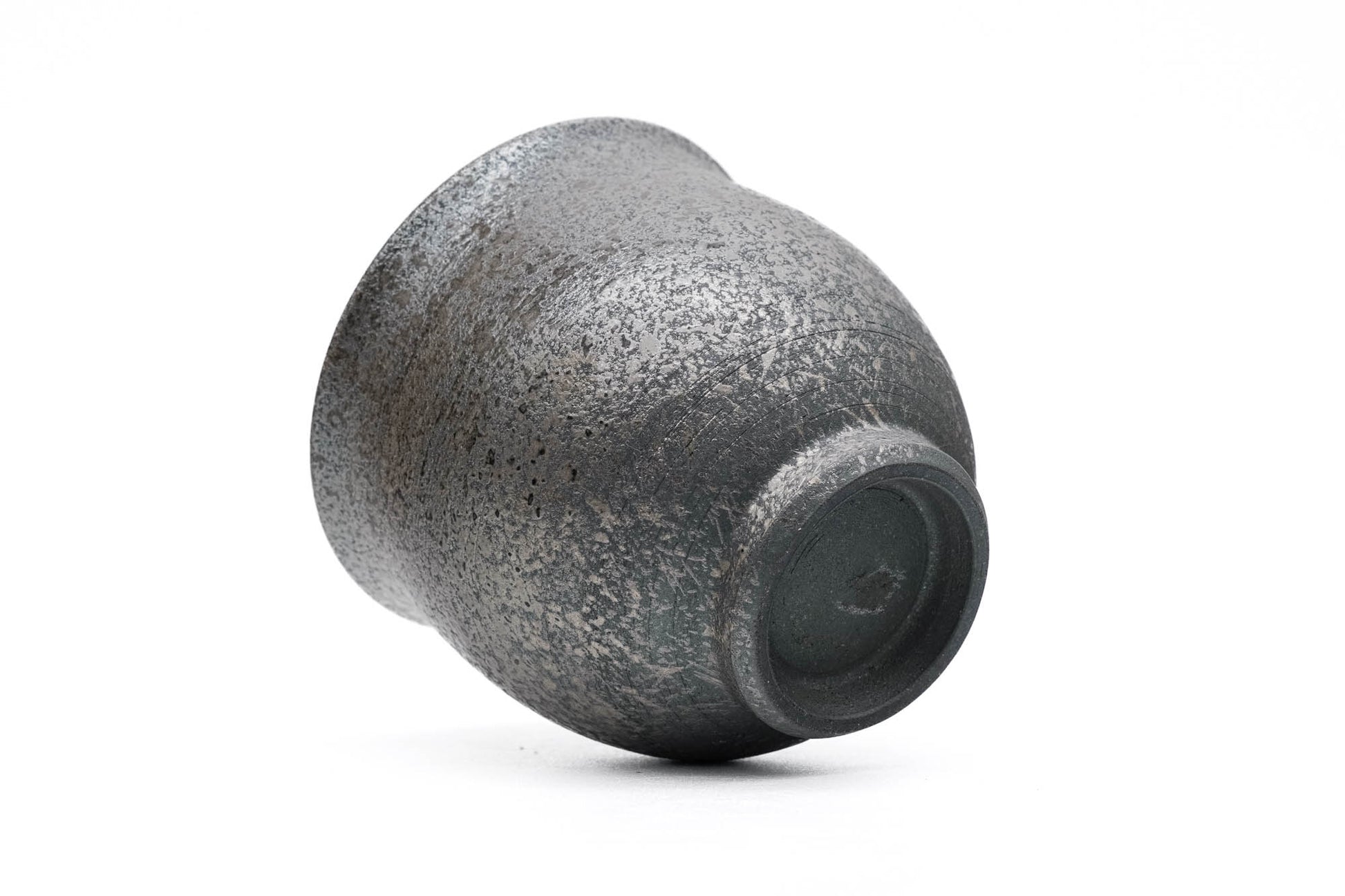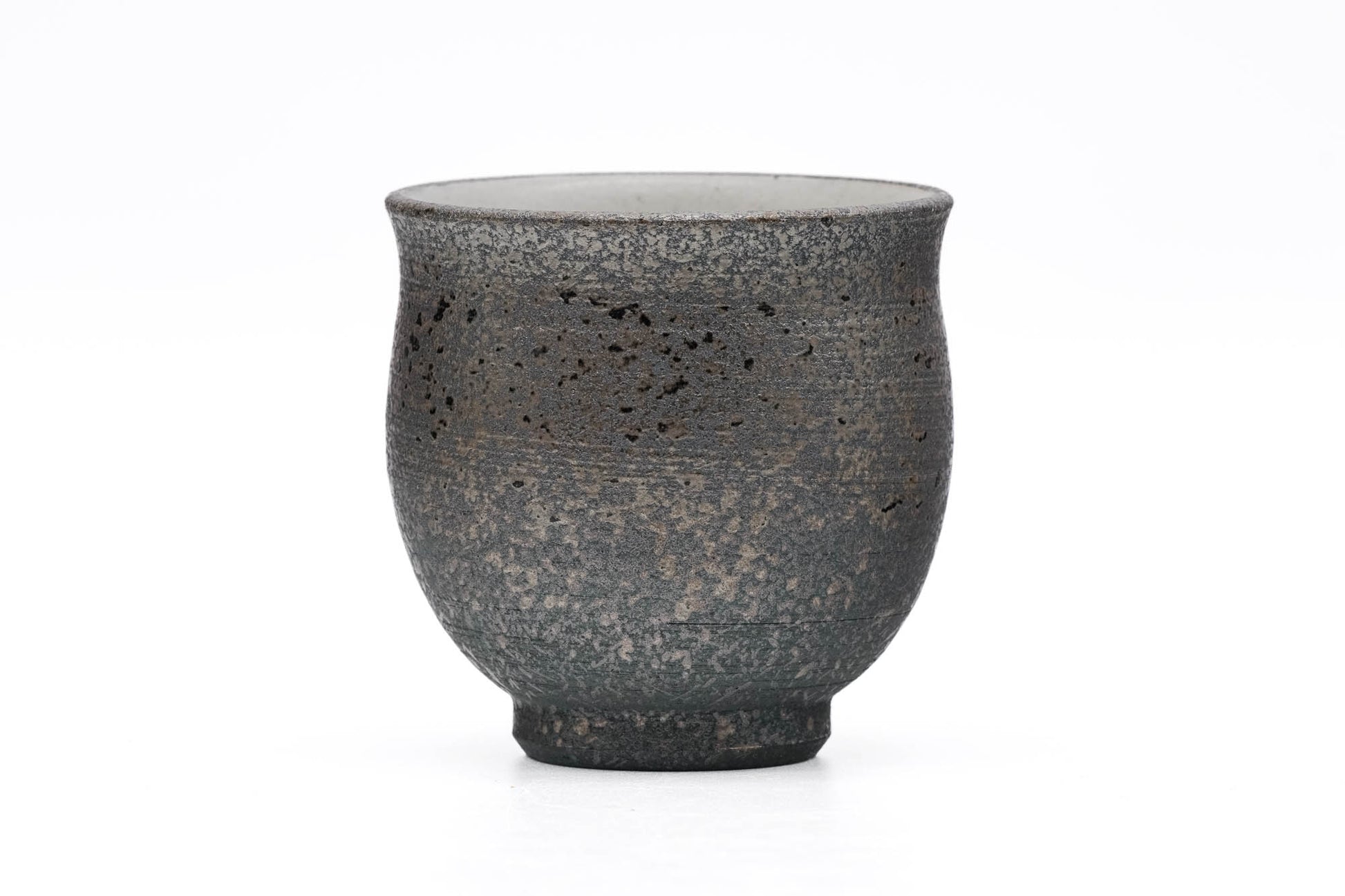 This unique Tokoname-yaki yunomi (teacup) has a slightly waisted shape that flares at the lip. It is made from a black clay splattered with an ash glaze in a style called haikake (»Ғì). The interior is glazed with white so that the colour of the tea can be appreciated.