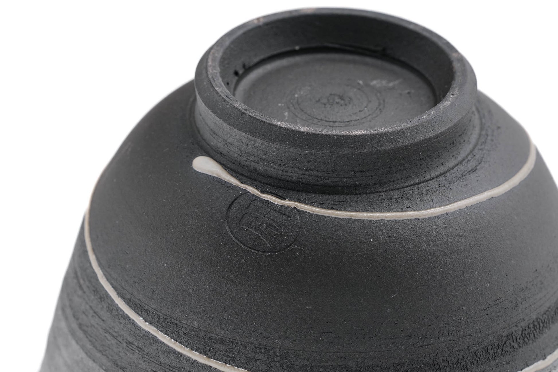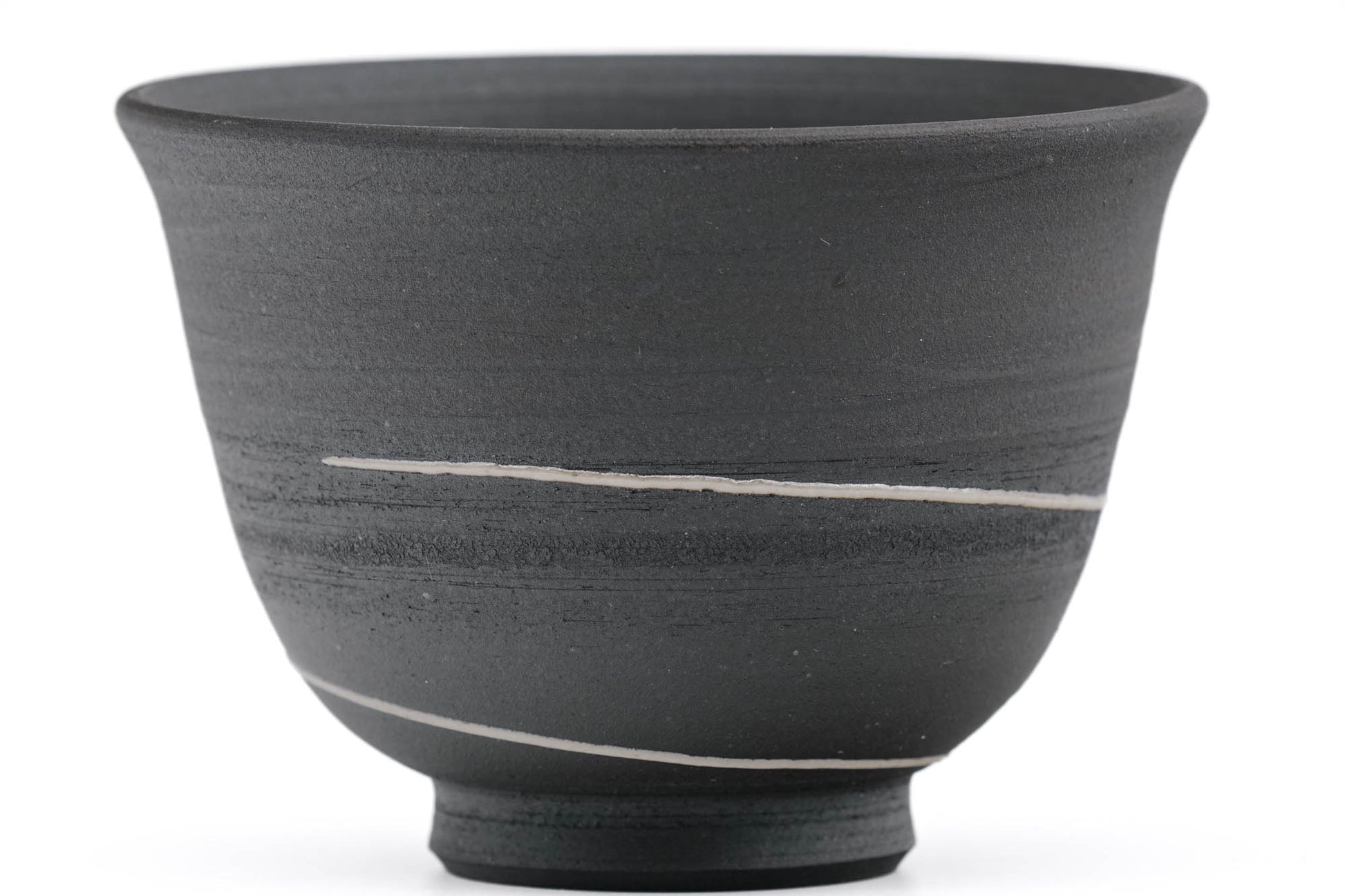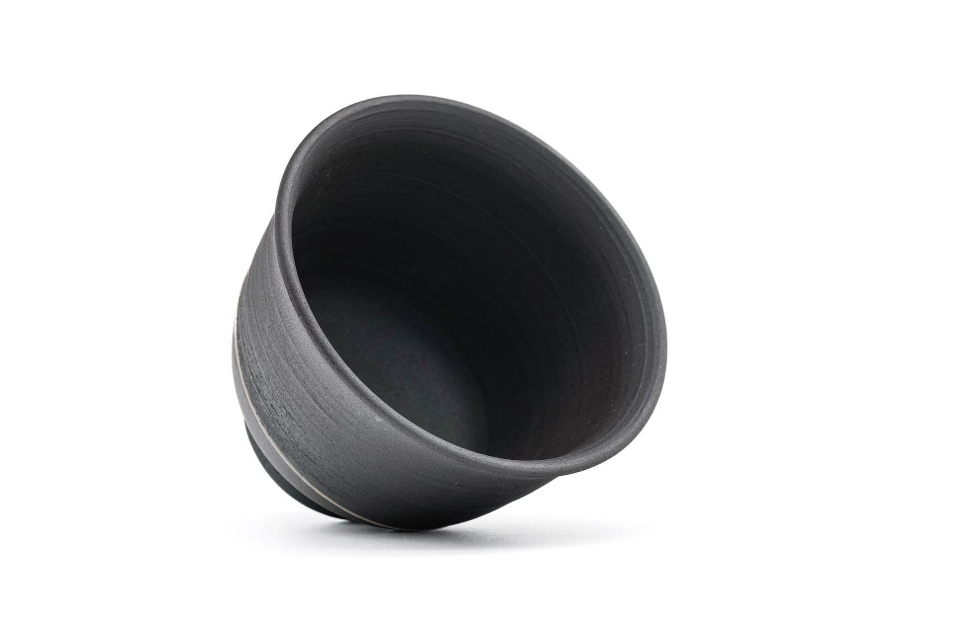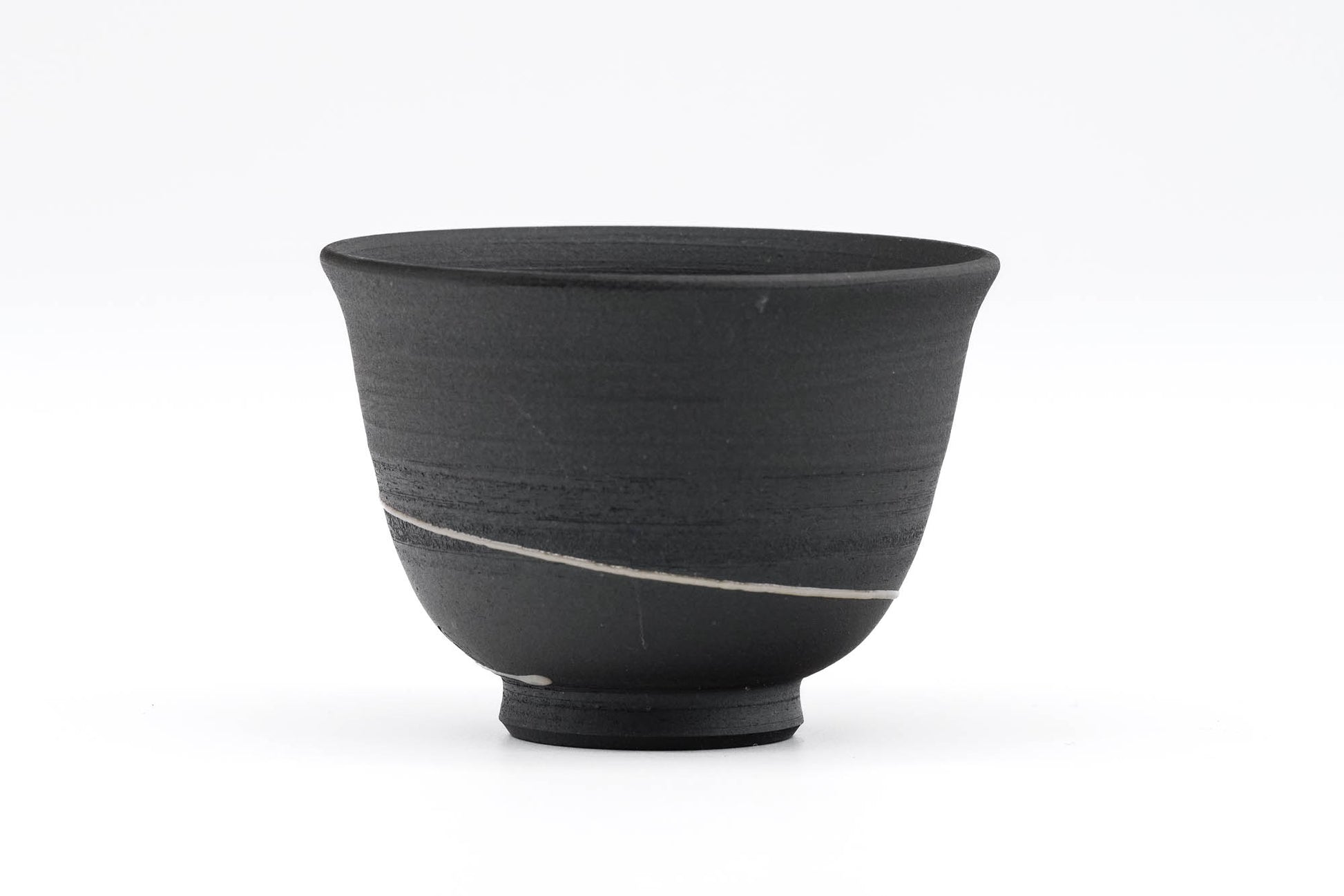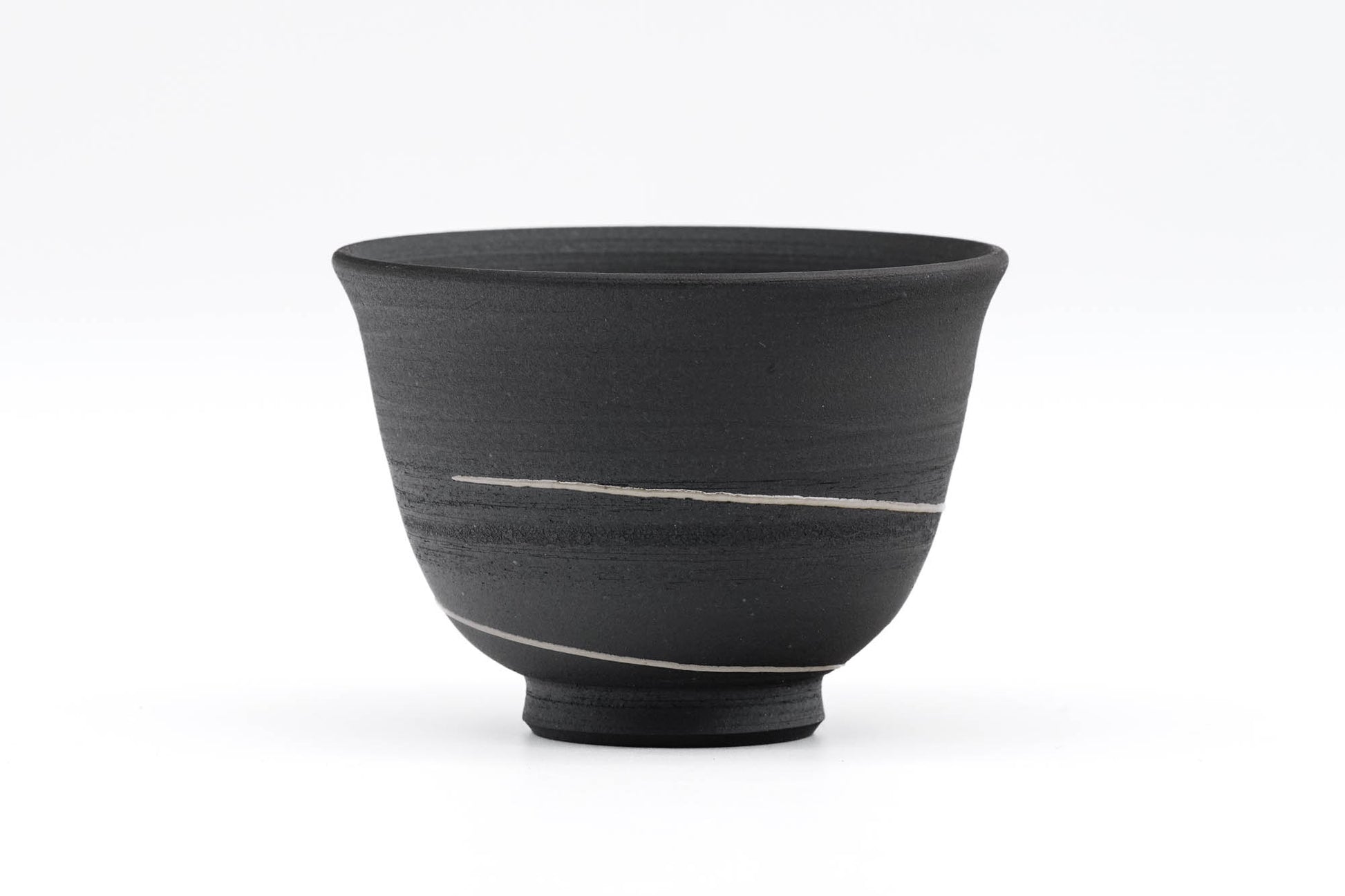This sleek Tokoname yunomi (teacup) is made from a black clay and has a classic tulip shape with a subtly everted lip. The surface of the clay is left unpolished, giving it a matte finish and slightly textured feel. The cup is decorated with a thin white line of glaze that spirals around the cup and stops at the foot.