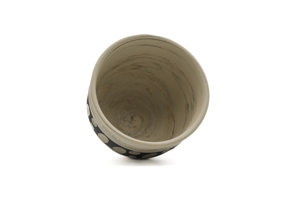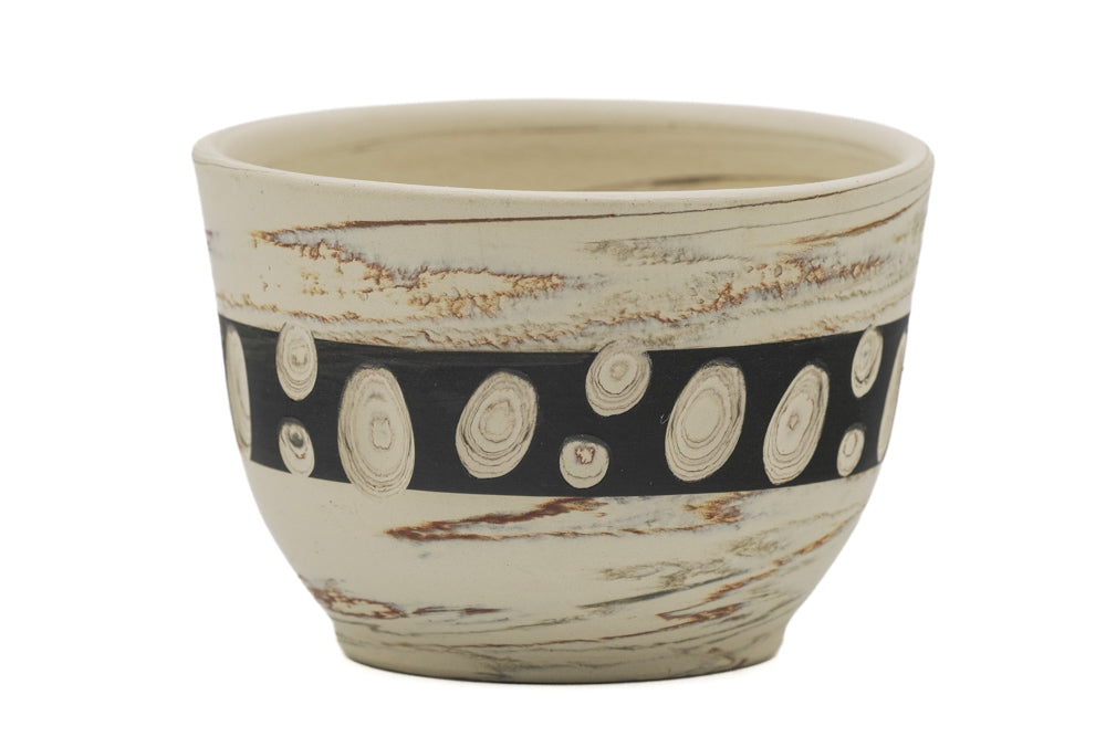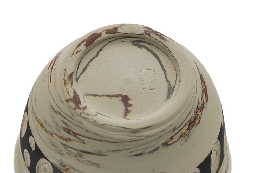 This stunning marbled Tokoname-yaki yunomi (teacup) has a classic shape with a slightly everted lip, and is made from multiple colours of clay kneaded into a white clay base in the nerikomi (¾š¤êÞz¤ß) technique. The cup is further decorated with a belt of blue-black, with round dot scooped out, revealing the marbled white colour underneath. This traditional pattern is called mizutama (ˮÓñ - water drop).